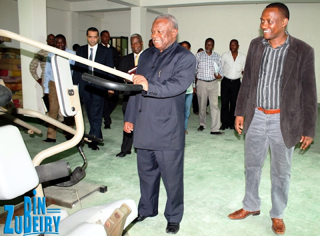 | Mkuchika pembeni ya Makamu Mwenyekiti wa Yanga, Clement Sanga akishika moja ya mashine za gym za klabu hiyo |