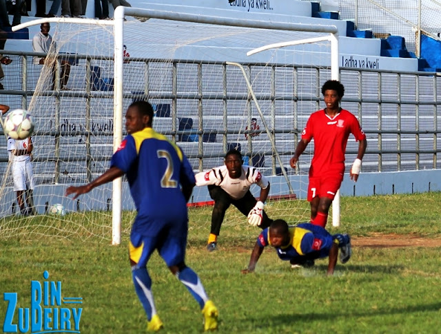 | Mussa Mgosi akipiga kichwa huku kipa wa Coastal, Shaaban Kado akipeleka mikono kuokoa |