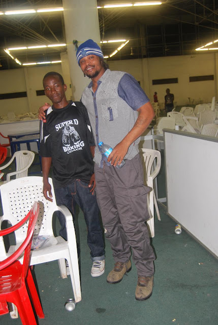 | Shomari kimbau akiwa na Cheka baada ya kumvisha ubingwa wa IBF Africa aliokuwa akiutetea |
