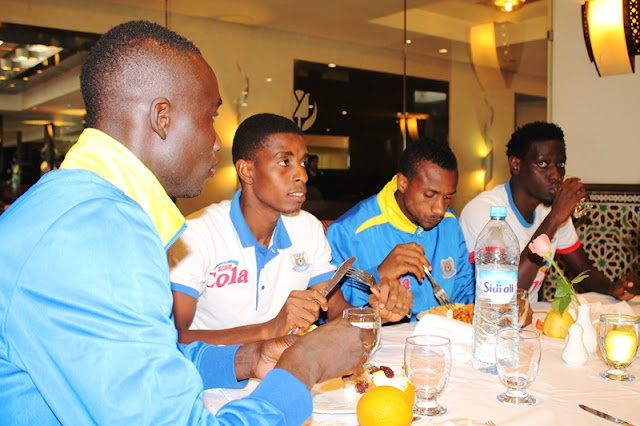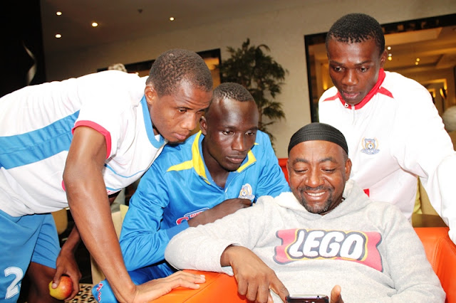 | Mbunifu; Msemaji wa Azam FC, Jaffar Iddi kulia akiwaonyesha blog ya BIN ZUBEIRY wachezaji wa Azam FC kupitia simu lake la hatari la Galaxy SII |