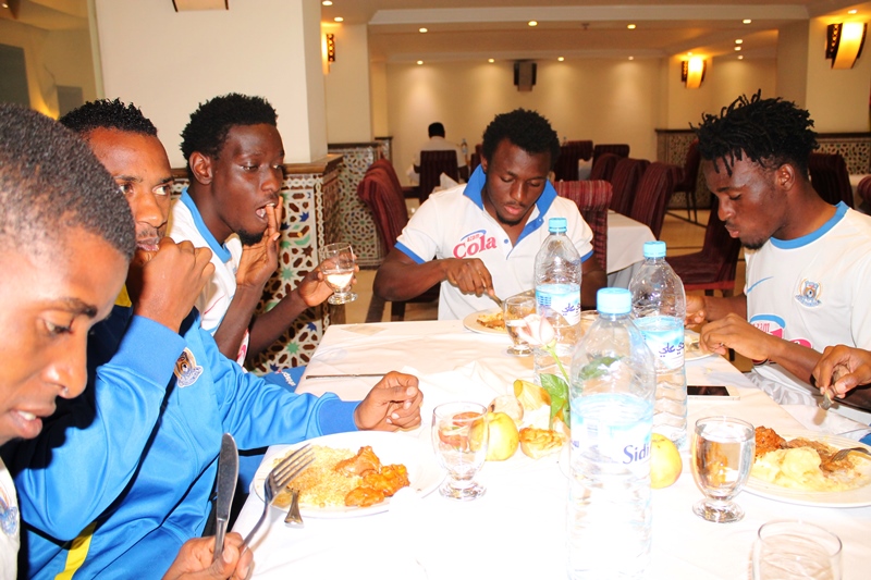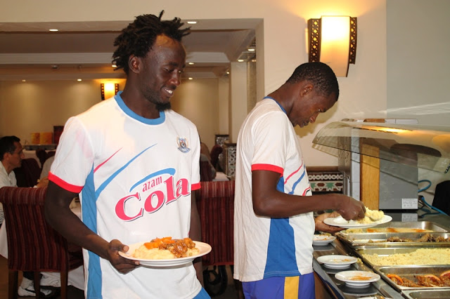 | Kocha Muingereza, Stewart Hall akijadiliana mambo na Mratibu wa Azam katika mashindano ya Afrika, Florian Kaijage leo Golden Tulip |