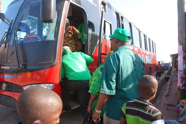 Wakiondoka kwenye ofisi ya CCM wilaya ya Kinondoni kwenda kupanda basi lililowafuata kwenye ofisi hiyo