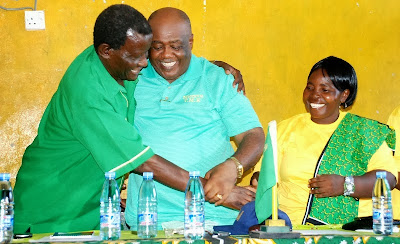MWENYEKITI wa CCM Kata ya Kibamba, Ayoub Semvua akimpongeza Mbunge wa Temeke, Dar es Salaam, Abbas Mtemvu, baada ya kuzungumza kama mgeni mwalikwa kwenye Kichao cha kawaida cha Hamlashauri Kuu Kata ya Azimio jimboni humo, jana jioni. Kulia ni Mwenyekiti wa CCM wa Kata hiyo Esa Uswege.
