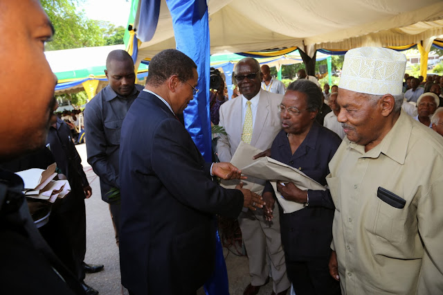 Rais Kikwete, Rais wa Zanzibar Dkt Ali Mohamed Shein na Makamu wa Rais Dkt Mohamed Ghalib Bilali wakiwapongeza wajumbe wa Tume kwa kazi nzuri
