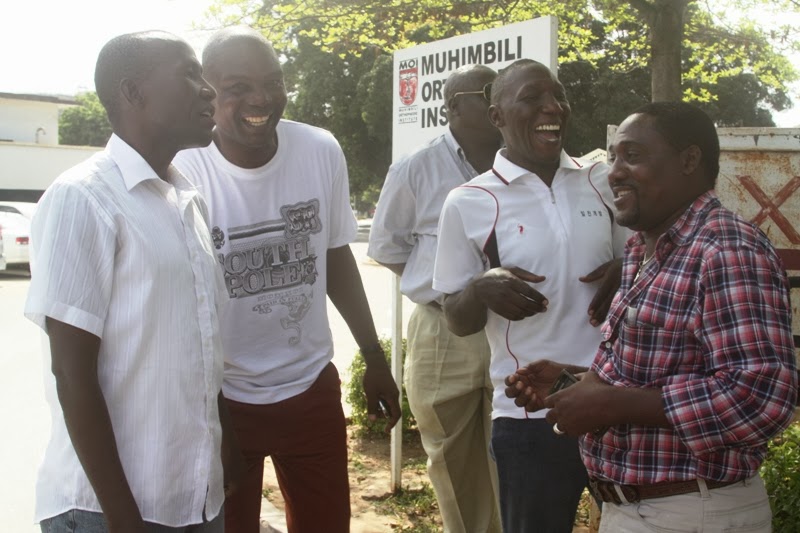 Wachezaji soka wa zamani wakijadiliana jambo nje ya Kanisa la Muhimbili walipokwenda kutoa heshima za mwisho kwa mwili wa marehemu James Kisaka. Kutoka kushoto ni Madaraka Selemani, Peter Tino, Khamis Kinye, Bakari Malima na Thomas Kipese.
