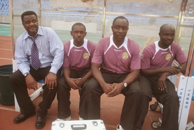 Kocha mkuu wa Mbeya City, Juma Mwambusi (wa kwanza kushoto) akiwa kiwa kwenye benchi na msaididizi wake Maka Mwalwisyi (wa pili kushoto)
