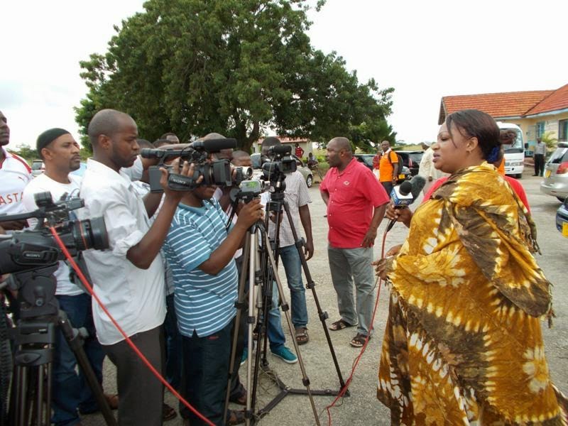 Mkuu wa wilaya ya Tanga,Halima Dendego akizungumza na waandishi wa habari katika uwanja wa Ndege jijini Tanga mara baada ya timu ya Coastal Union kuwasili katika uwanja huo ikitokea visiwani Pemba ilipokuwa imeweka kambi ya mwezi mmoja ikijiandaa na msimu mpya wa Ligi kuu soka Tanzania bara