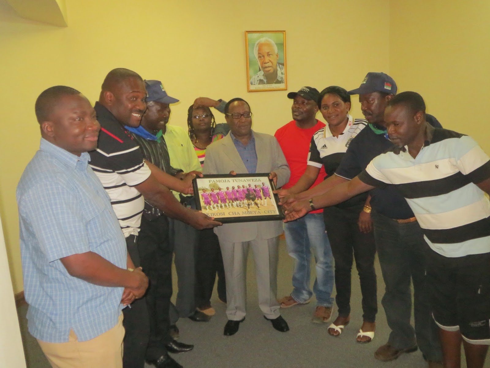 Patrick Tsere, mwenye suti katikati akipokea picha ya ya wachezaji wa Mbeya
