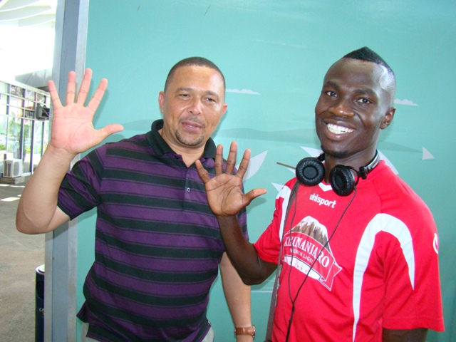 Makamu wa Rais wa Simba sc, Geofrey Nyange 'Kaburu' (kushoto) akiwa na Emmanuel Okwi (kulia)