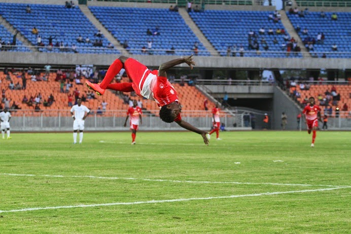 Mshambuliaji wa Simba sc, Paul Kiongera akiruka sarakasi baada ya kuifungia Simba bao katika mechi dhidi ya Gor Mahia jumamosi iliyopita