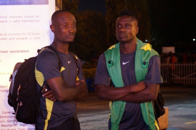 Amissi Tambwe (kushoto) na Mbuyu Twite wakibadilishana mawazo wakati wakisubiri muda wa kuondoka