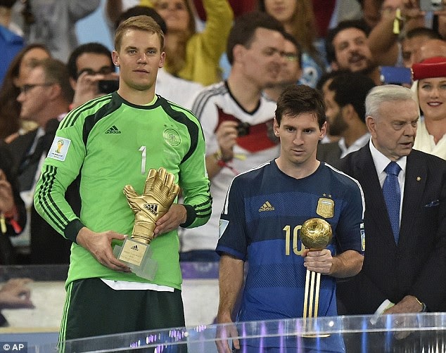 Manuel Neuer na Messi wakiwa wameshika zawadi zao baada ya mchezo wa fainali wa kombe la dunia nchini Brazil.