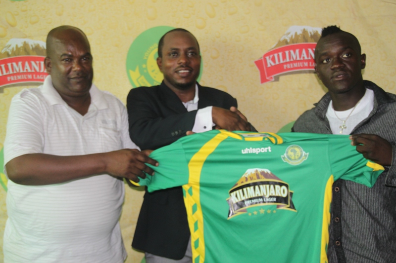 Busungu (wa kwanza kutoka kulia) akikabidhiwa jezi na Mkuu wa Idara ya Habari na Mawasiliano ya Yanga, Jerry Muro (katikati) wakati winga huyo alipotambulishwa rasmi leo.