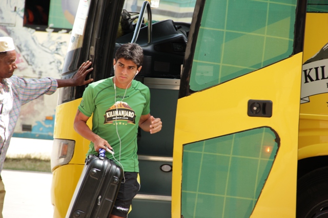 Kiungo mshambuliaji wa Yanga, Mbrazil, Andrey Coutinho akishuka kwenye basi la Yanga muda mfupi uliopita tayari kwa mechi ya saa 10:00 dhidi ya KMKM ya Zanzibar