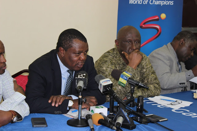 | Katibu mkuu wa CECAFA, Nicholas Musonye(wa tatu kulia) akiwa na rais wa baraza hilo, Leodgar Tenga (wa pili kulia), na raisi wa TFF, Jamal Malinzi(kulia) katika katika mkutano na waandishi wa habari. |