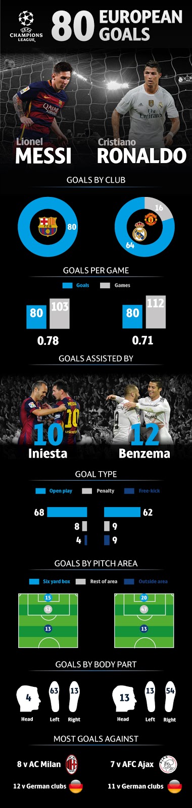 Lionel Messi na Cristiano Ronaldo wote kwa pamoja wana magoli 80 katika michuano ya Ulaya – lakini je, kila mmoja amefunga kuoka eneo gani? je, kutoka upande gani (kushoto ama kulia)? ndani ya boksi au nje ya boksi? dhidi ya nani (timu gani)? Takwimu zote zipo hapa
