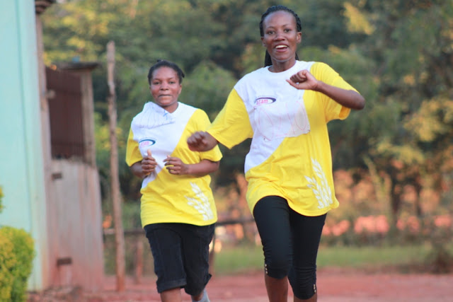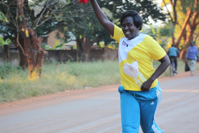 Theresia Tembo akishangilia baada ya kushika nafasi ya tatu kwenye mbio za Km 5 kwa upande wa wanawake