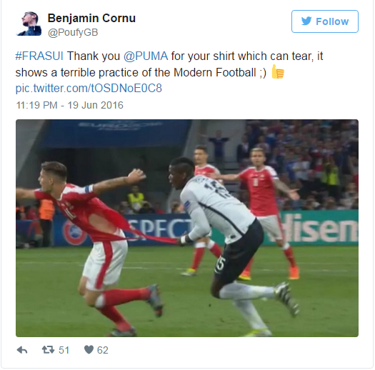 Mapema leo nyota wa Uswizi XHERDAN SHAQIRI alikaririwa akisema "Puma hawawezi kutengeneza kondom" baada ya mchezo wao dhidi ya Ufaransa kufuatia kushuhudia jezi za wachezaji wenzake wanne zikichanika..