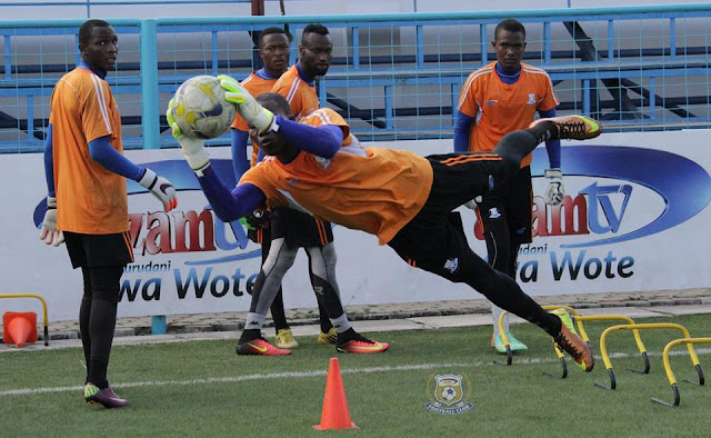 Kipa wa Azam Mwadini Ally akionesha utaalamu wake wa kudaka wakati wakifanya mazoezi leo asubuhi kwenye Uwanja wa Azam Complex, Chamazi kujiandaa na mchezo wa mchezo wa Ngao ya Jamii dhidi ya Yanga utakaochezwa Jumatano wiki hii.