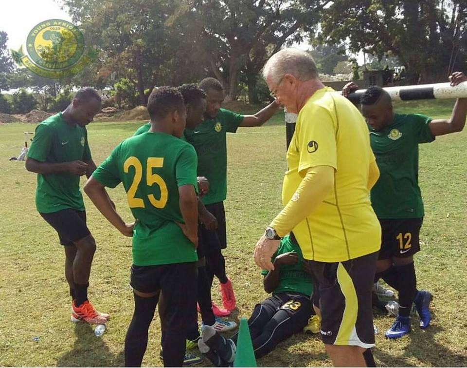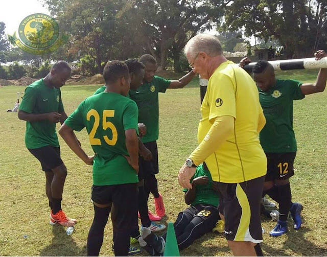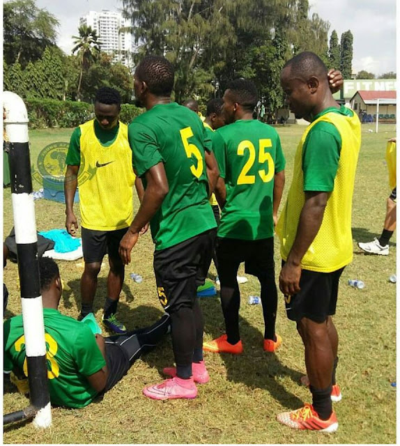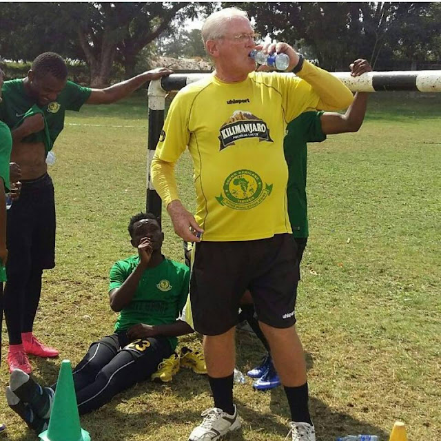 Kocha Hans van Der Pluijm akipata maji baada ya kazi nzito huku vijana wake wakiwa wamepumzika kidogo.