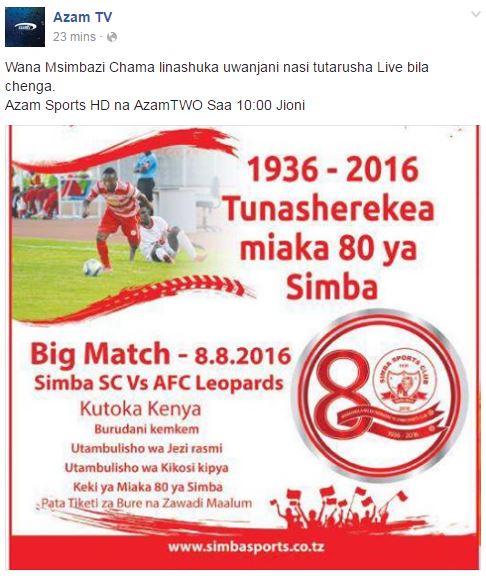 Azam TV kupitia ukurasa wake wa mtandao wa kijamii wa facebook imethibitisha kuwa Simba SC vs AFC Leopard itakuwa live kupitia chaneli ya AZAM TWO na AZAM SPORTS HD.
