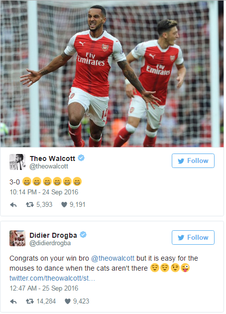 Drogba aiandika hivi: 'Hongera sana kwa ushindi bro @theowalcott, lakini ni rahisi sana kwa panya kutawala pale paka anapokuwa hayupo'.