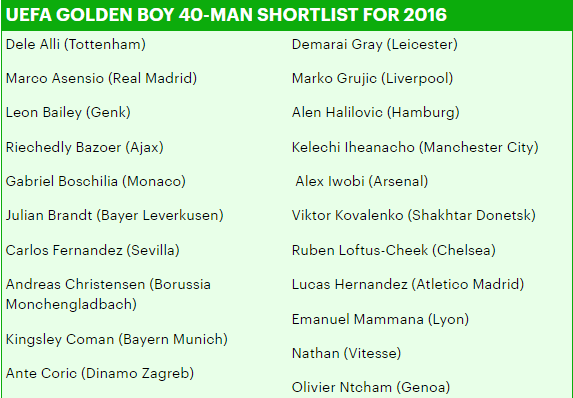 HII NDIYO ORODHA YA WACHEZAJI 40 VIJANA WANAOWANIA TUZO YA UEFA GOLDEN BOY 2016