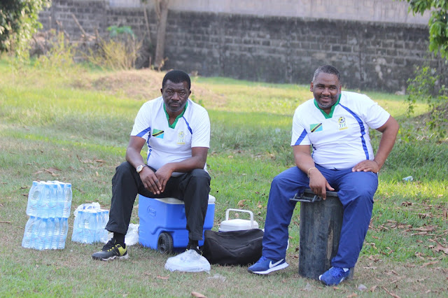 Madaktari wa Timu ya Taifa ya Vijana wenye umri wa chini ya miaka 17 - Serengeti Boys, Dk. Sheicky Mngazija (kushoto) na Gilbert Kigadye wakifuatilia kwa karibu mazoezi ya timu kwenye Uwanja wa Seminari Kuu ya Kumbukumbu ya Kardinali Emile Biayenda wa Kanisa Katoliki, Jimbo Kuu la Brazzaville, Jamhuri ya Congo. Serengeti Boys inajiandaa kucheza na vijana wa Congo, Jumapili ya Oktoba 2, 2016 kwenye dimba la Alphonse Massamba-Débat ulioko kwenye Makutano ya Barabara za Nkolo na Boko, hapa jijini Brazzaville. (Picha na Alfred Lucas wa TFF).