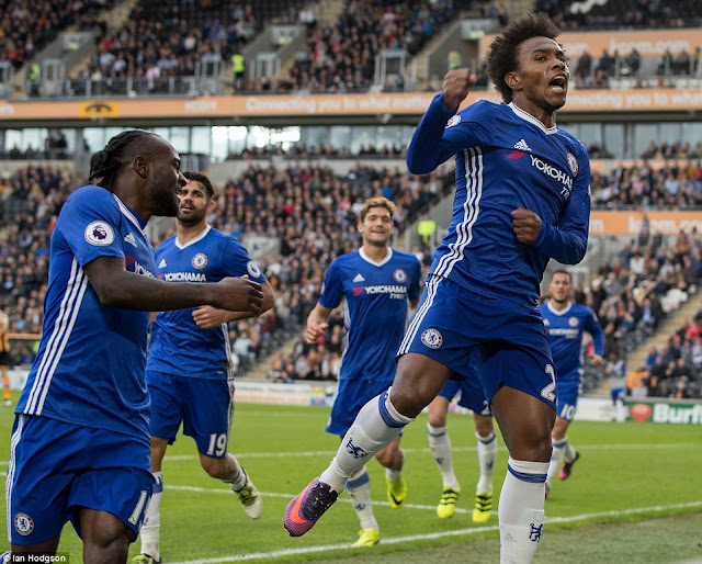 Chelsea wamerejea katika njia za kushinda kwenye mitanange ya Ligi kuu ya Soka ya England baada ya Wabrazil wawili,Willian na Diego Costa kuifungia mabao mawili kwa bila dhidi ya Hull City.