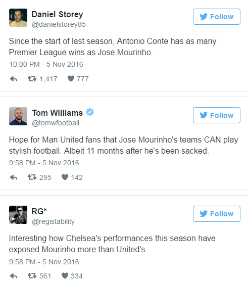 Jose Mourinho watching Eden Hazard and Diego Costa tear it up for Chelsea pic.twitter.com/Mwd7EF9v2P— The Sun Football ⚽ (@TheSunFootball) November 5, 2016